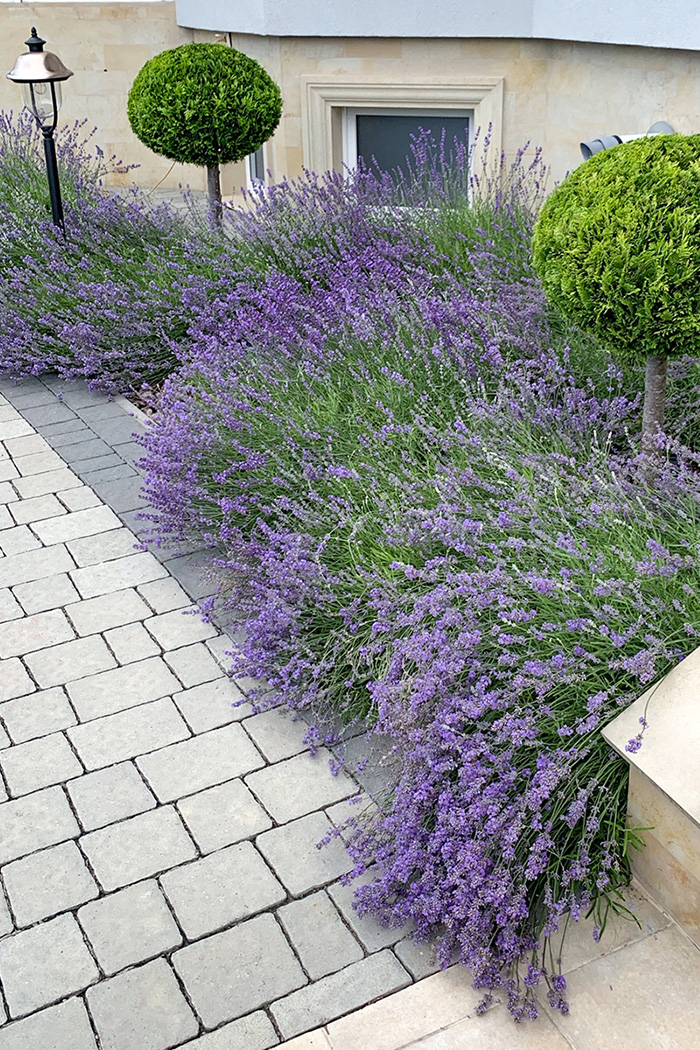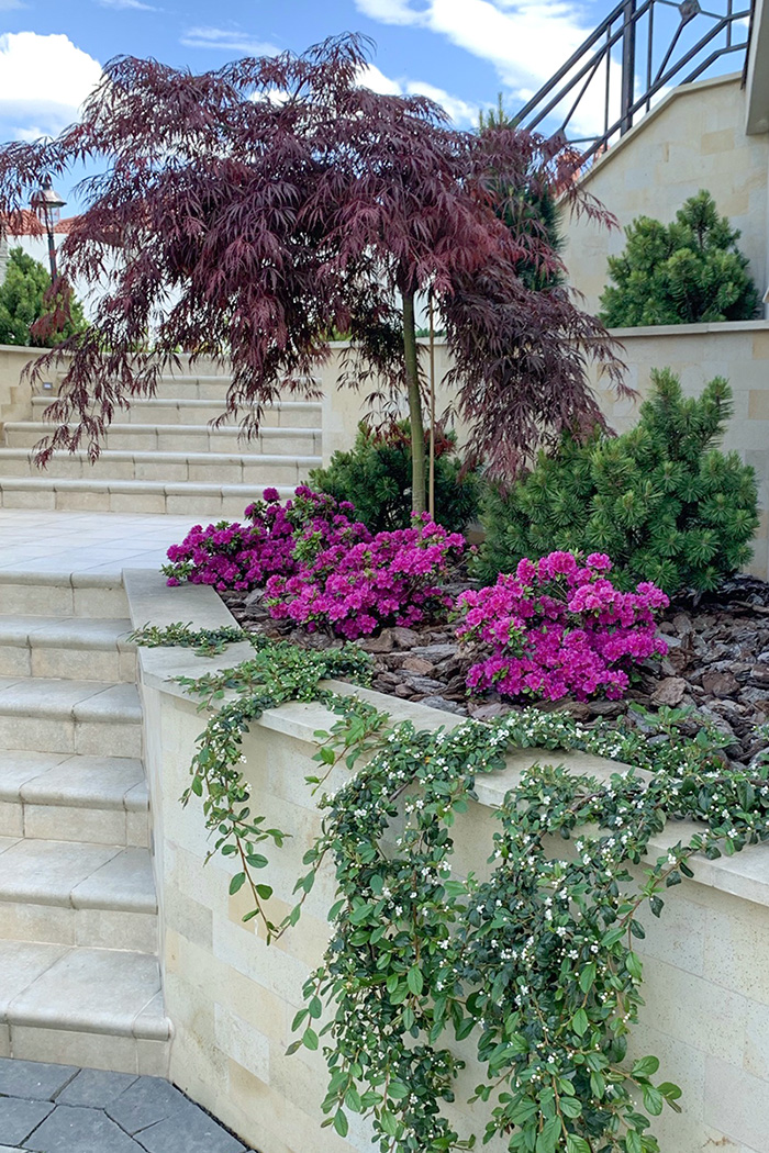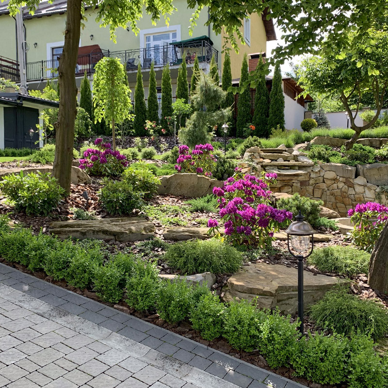 Between the upper and lower terraces, green plants are located on the slope. Old hornbeams which were preserved during construction works embellish the landscape. Below their canopy, rhododendron and mugo pine arrays are planted. The terrain made it possible to place a waterfall between the terraces and a pond at the lower terrace. A fireplace zone is located near the waterfall foot. This is one of the favorite parts of the garden as there one can contemplate living fire and surface of the pond as well as enjoy waterfall murmur.