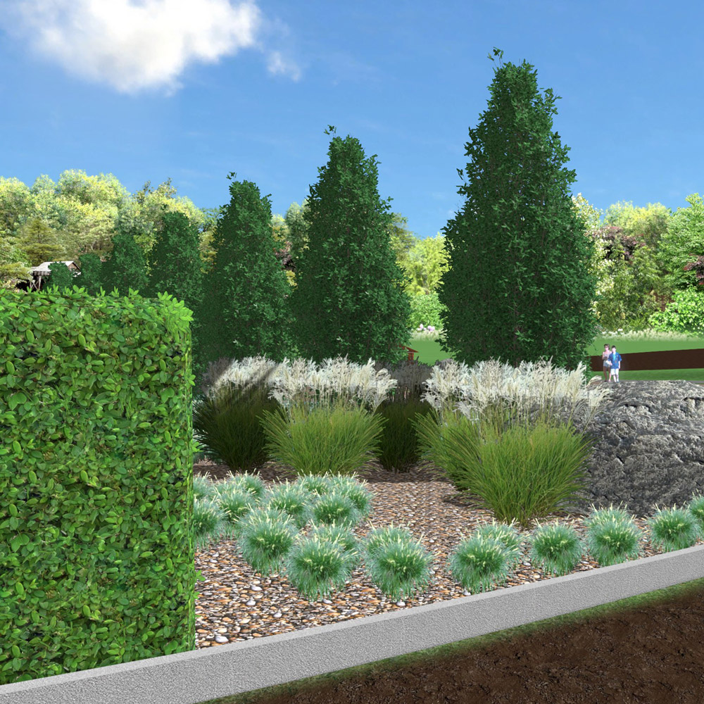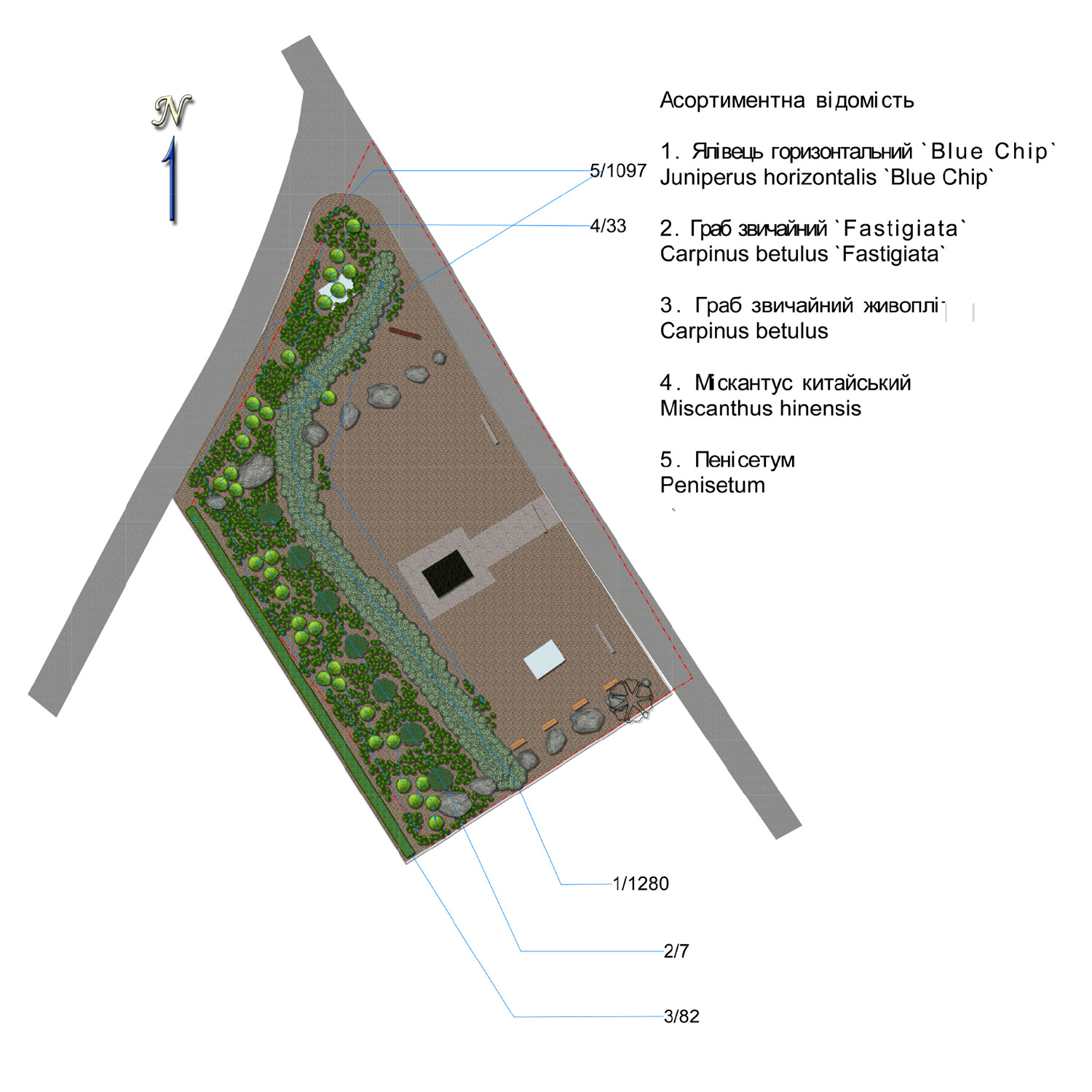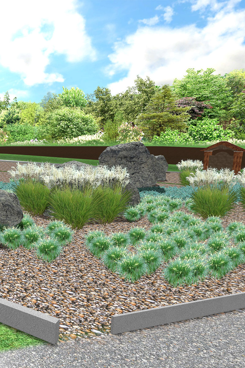 We have designed a project which includes the following elements: leveling of the soil surface and excavation of shallow channels for drainage, application of the soil barrier and gravel layer, selection and plantation of trees and bushes, design and installation of small architectural forms (stones and benches), manufacture and installation of an informative sign, integration of two existing monuments of the Memorial.
