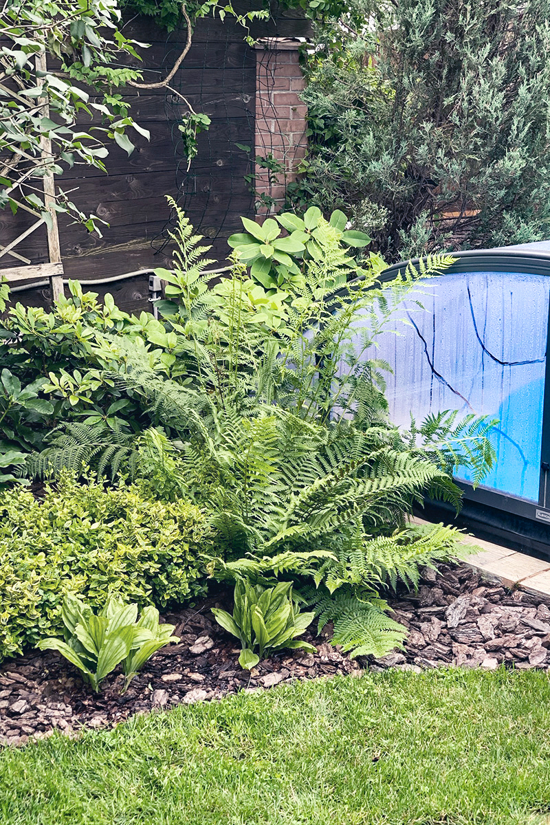 There are high shrubs and trees near the swimming pool. An array of rhododendrons is bedded in their shadow. This composition creates gorgeous scenery in spring.