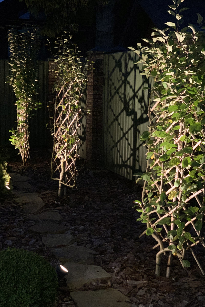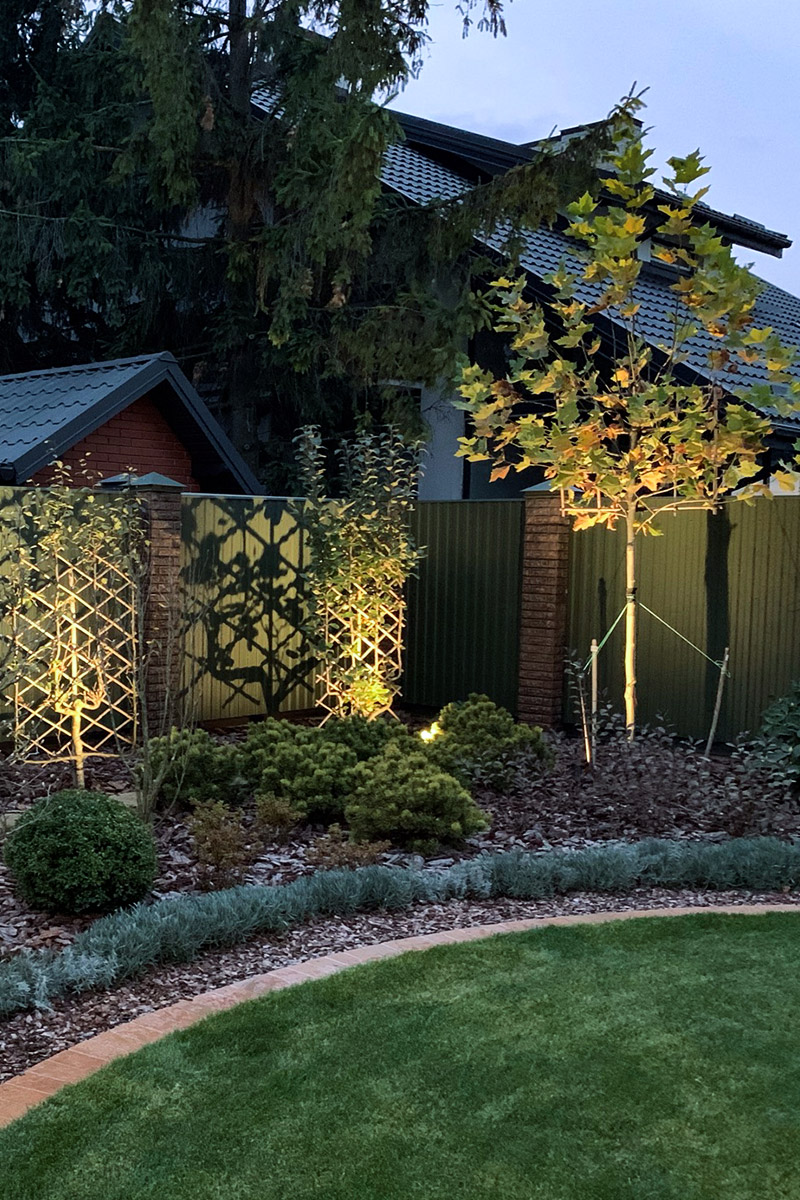 Всі остальні площі засаджені масивами із гірських сосен, азалій, карликових вейгел і декількома акцентами із кущових магнолій. Попри паркан посаджені плодові дерева шпалерним методом. Інша межа ділянки обрамлена боскетами із платанів. А декоративне освітлення ввечері доповнює всю красу саду.